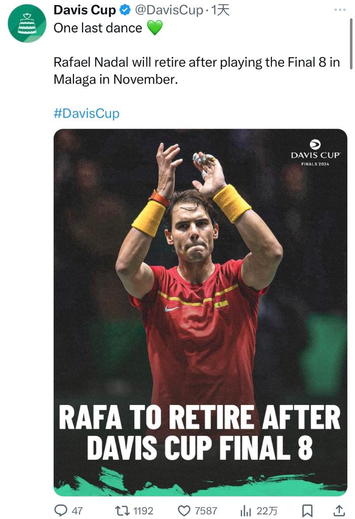 “最后一舞。”戴维斯杯官方账号写道。纳达尔将于11月代表西班牙队出战2024戴维斯杯男子网球团体赛决赛,这将是他职业生涯的最后一站赛事。