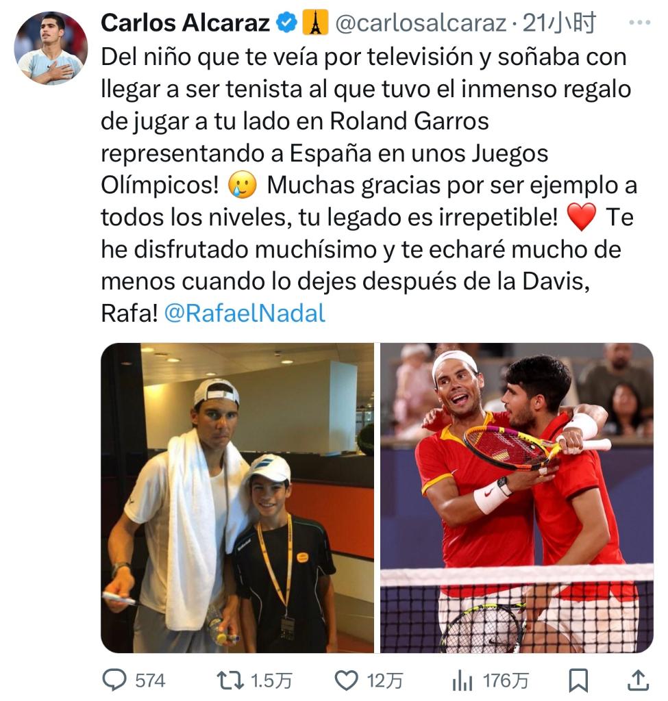 “小时候我在电视上看你比赛,并梦想着有一天能作为网球运动员。能与你一起在罗兰·加洛斯代表西班牙队并肩征战奥运会,带给我极大的快乐。感谢你在各个层面上都是榜样。你的传奇无人能及。”西班牙小将阿尔卡拉斯在巴黎奥运会上与偶像纳达尔并肩征战男双,最终止步四分之一决赛。