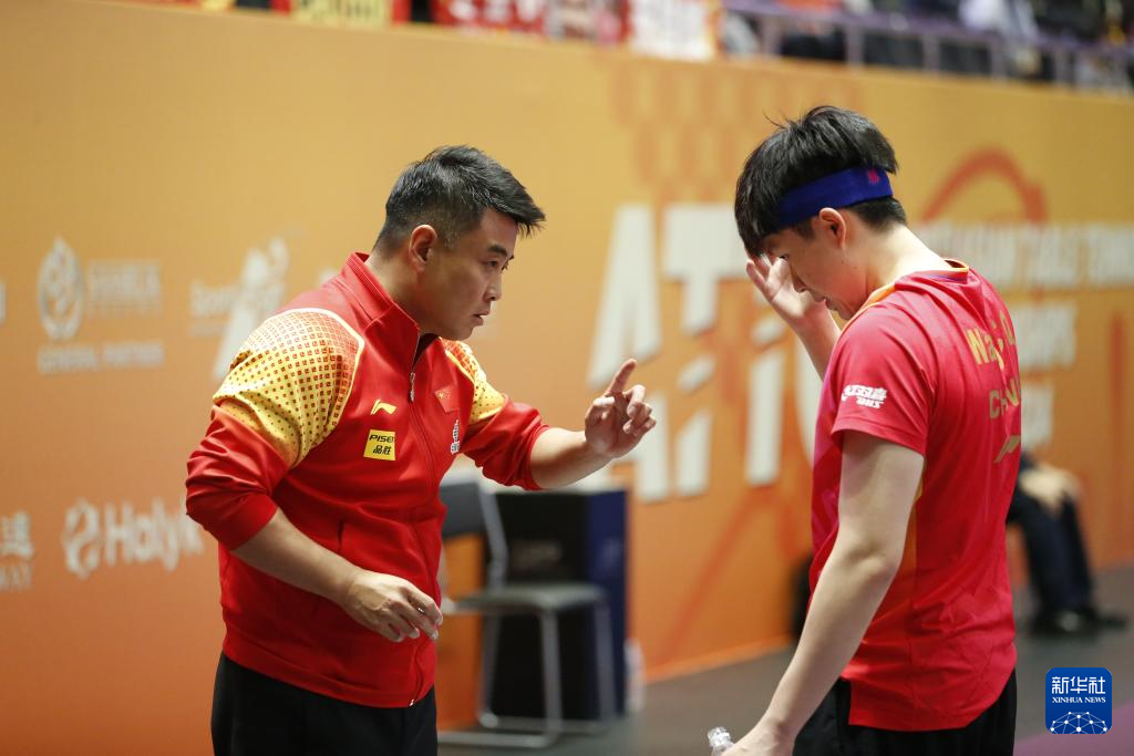 10月12日,中国队教练王皓(左)在比赛间隙对王楚钦进行指导。