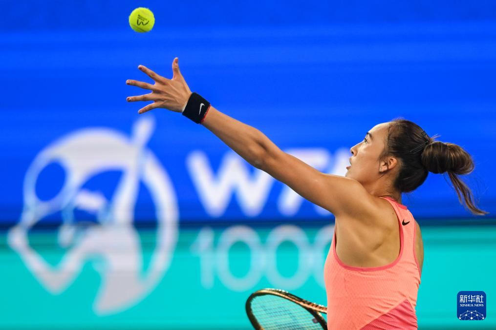 10月12日,郑钦文在比赛中发球。新华社记者 肖艺九 摄