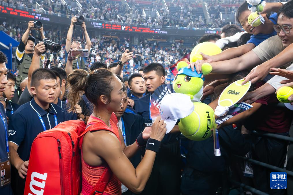 10月12日,郑钦文在赛后为球迷签名。新华社记者 肖艺九 摄
