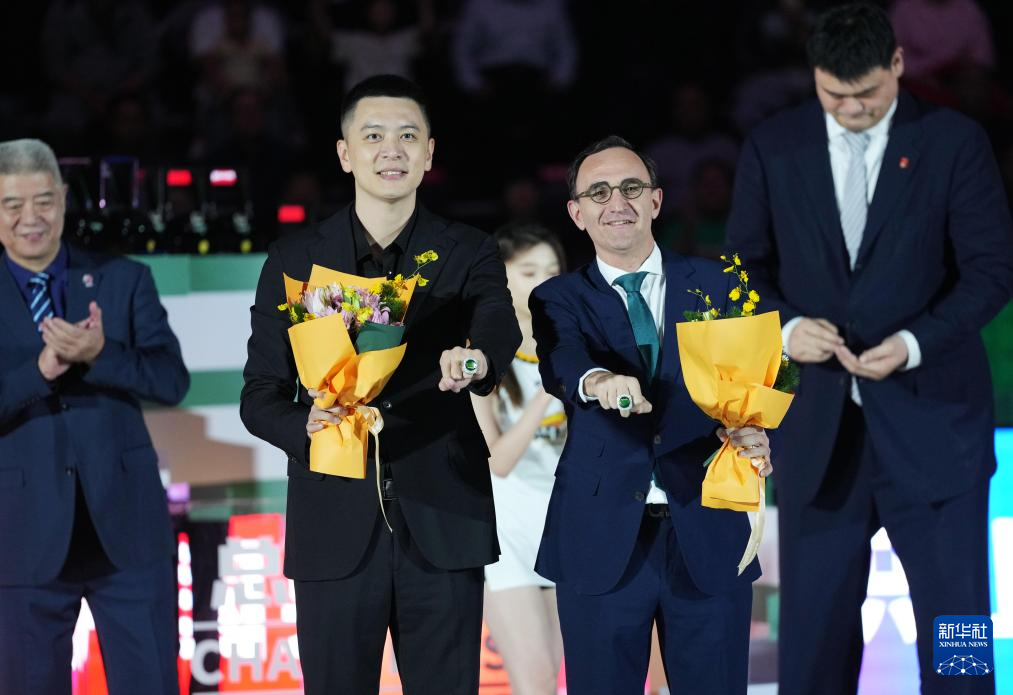 10月12日,辽宁本钢队主教练杨鸣(前左)在赛前展示上赛季总冠军戒指。