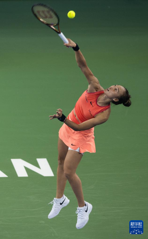 10月13日,郑钦文在比赛中发球。