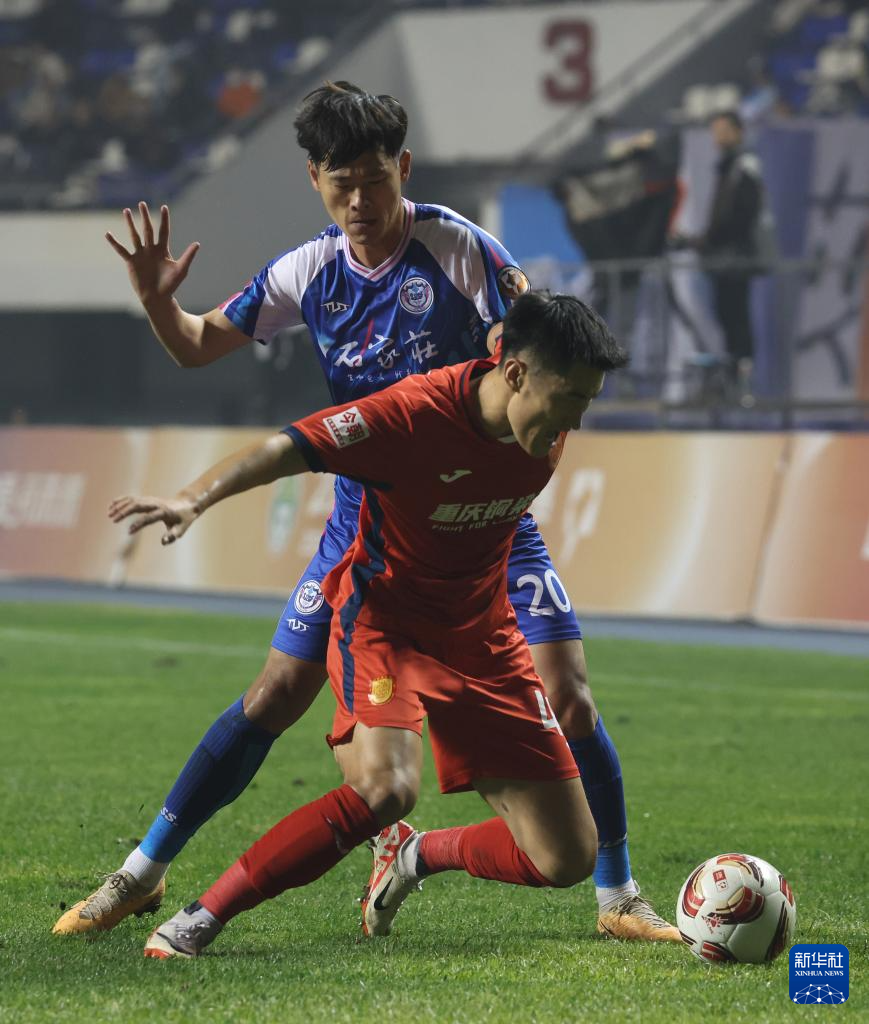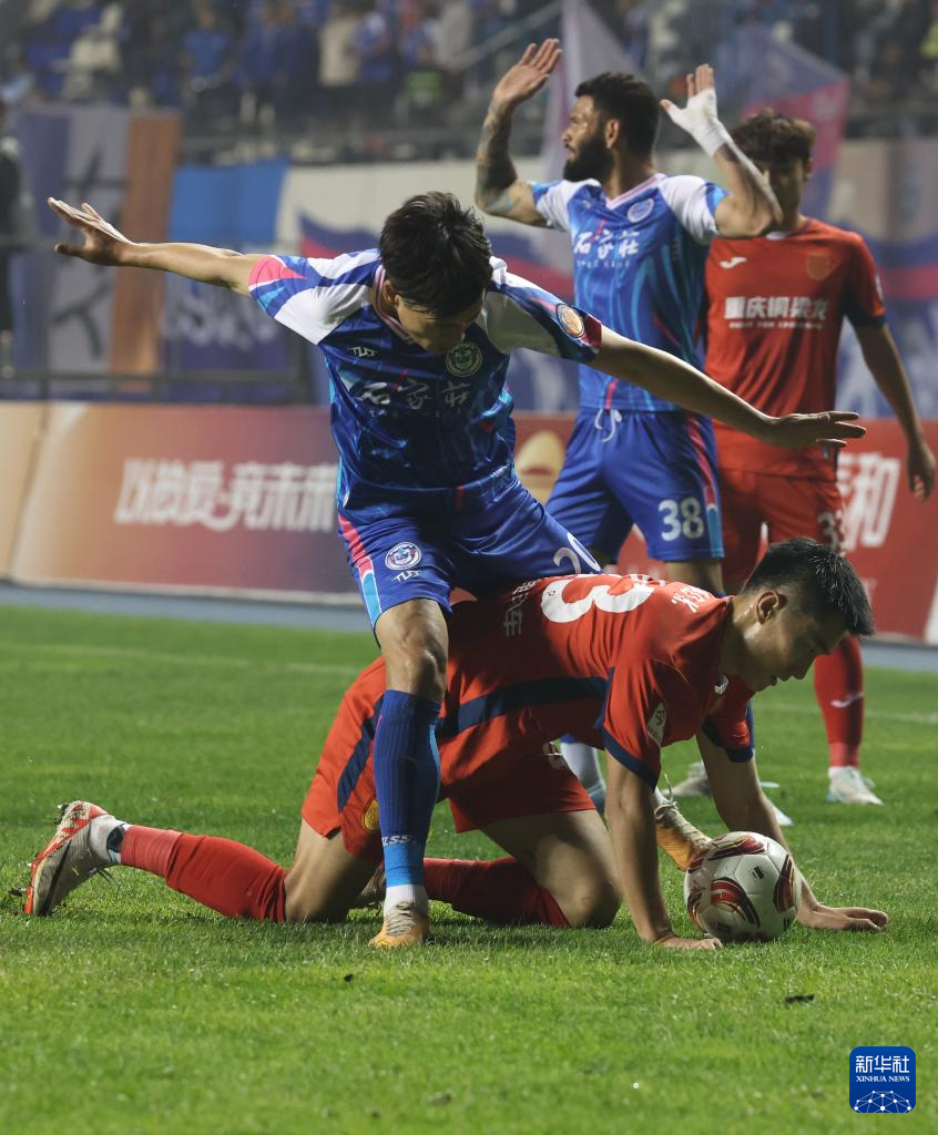 10月13日,石家庄功夫队球员刘乐(后)与重庆铜梁龙队球员肖鲲在比赛中拼抢。