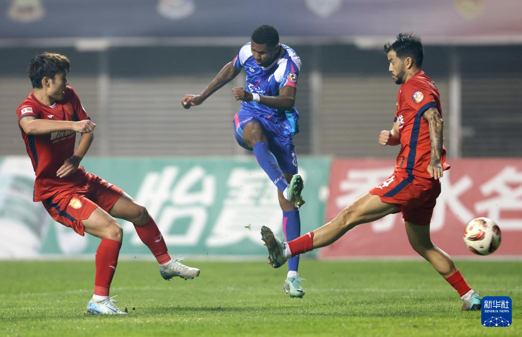 10月13日,石家庄功夫队球员阿约维(中)在比赛中射门。
