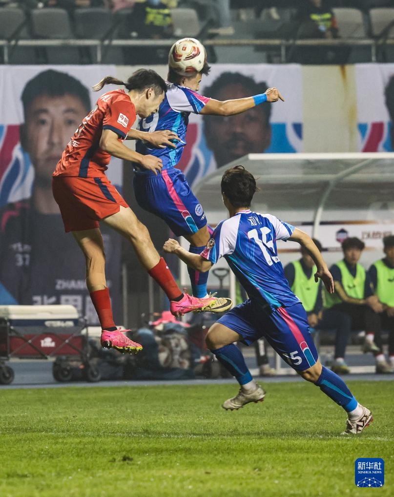 10月13日,石家庄功夫队球员徐俊驰(中)在比赛中争顶。