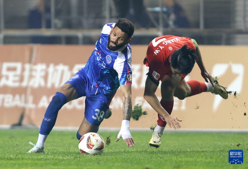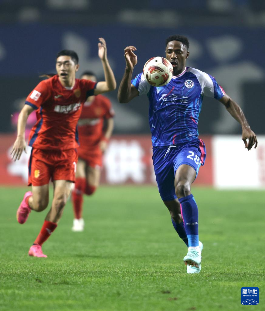 10月13日,石家庄功夫队球员梅西·保利(右)在比赛中带球进攻。