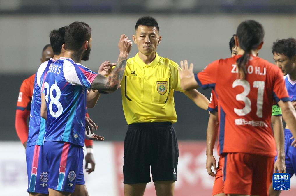 10月13日,主裁判甄伟(中)在比赛中与双方球员交流。