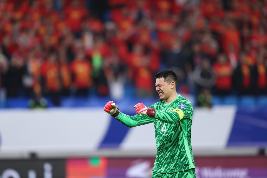10月15日,中国队守门员王大雷赛后庆祝获胜。新华社记者 贾浩成 摄