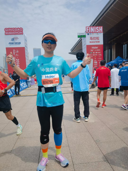 耳边呼啸的风声、热情的加油呐喊声,像给双腿装上马达,奔跑起来更加有力量!在这样热烈的氛围下,我跑出了个人首次成绩5:23:44,冲线时一瞬间,泪水和汗水交织在一起,这一刻内心无比欣慰、自豪!