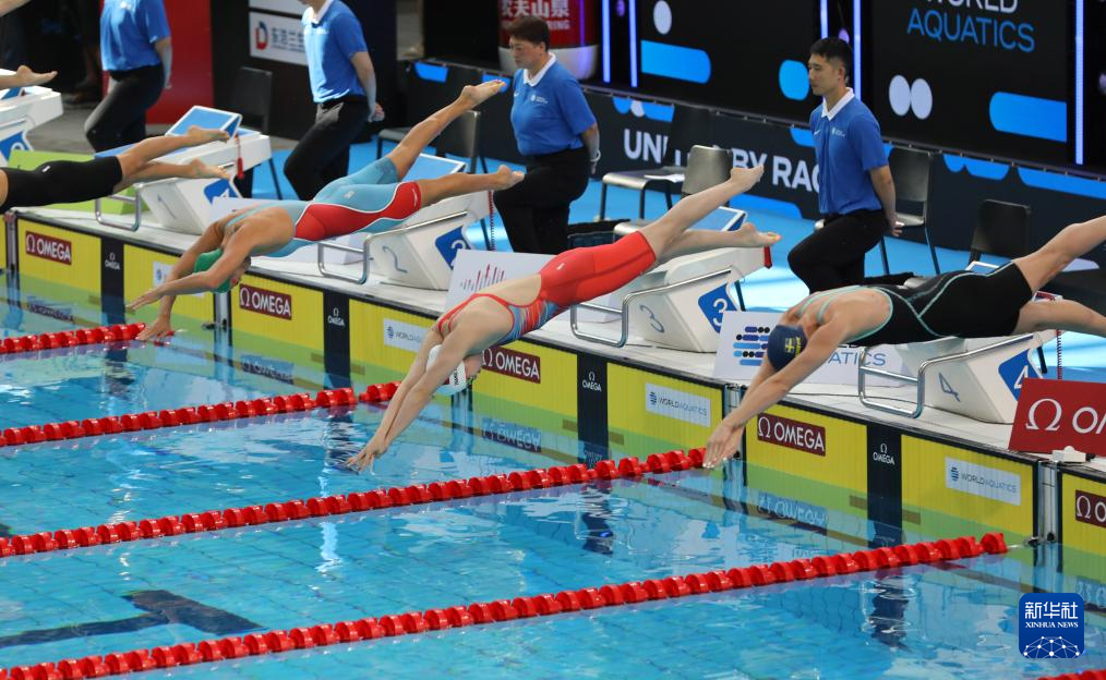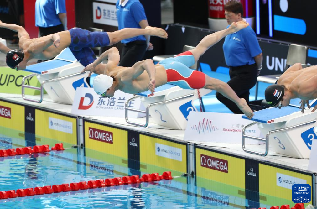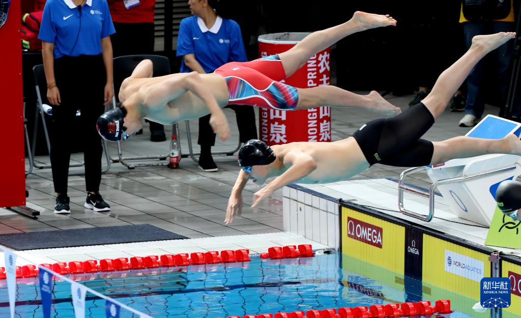 10月18日,中国选手潘展乐(上)在男子100米个人混合泳预赛中出发。最终,他晋级决赛。