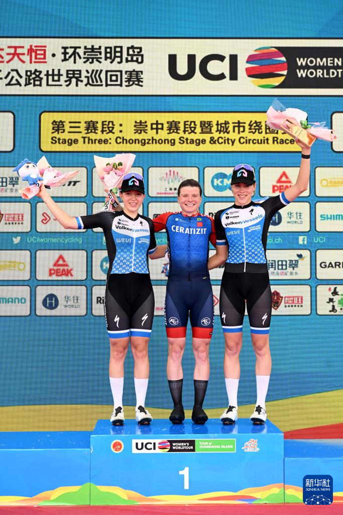 10月17日,赛段个人成绩冠军森拉天时WNT女子职业车队选手玛尔塔·拉赫(中)、亚军沃克韦塞尔女子职业自行车队选手斯嘉丽·苏伦(左)和队友季军苏菲·范鲁伊扬在颁奖仪式上。