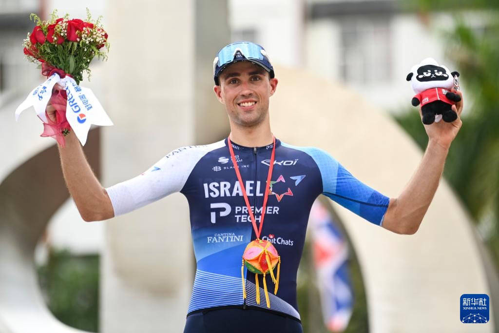 10月17日,获得爬坡总成绩第一名的迪卡侬AG2R车队比利时车手德里斯·德邦特(左)、获得赛段冠军的以色列博泰车队英国车手伊森·维尔农(中)和获得赛段敢斗奖的速的奥快步车队荷兰车手佩平·雷恩德林克在颁奖仪式上庆祝。