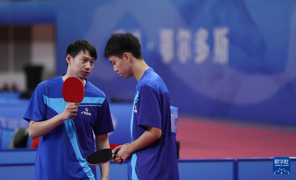 10月18日,河北队组合宁贤坤/周雨(左)在比赛中交流。最终,他们他0比3不敌福建队组合曾蓓勋/陈俊菘。