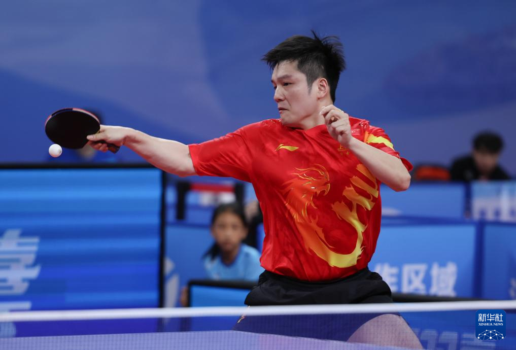 10月18日,上海地产集团队选手樊振东在单打比赛中回球。最终,他3比0战胜青海米粒队选手罗铮。