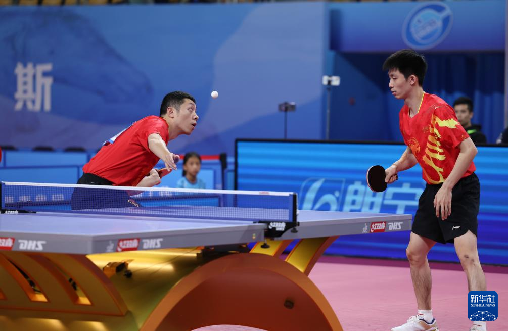 10月18日,上海地产集团队组合许昕(左)/周恺在双打比赛中。最终,他们3比0战胜青海米粒队组合陈磊欣/王麒凯。