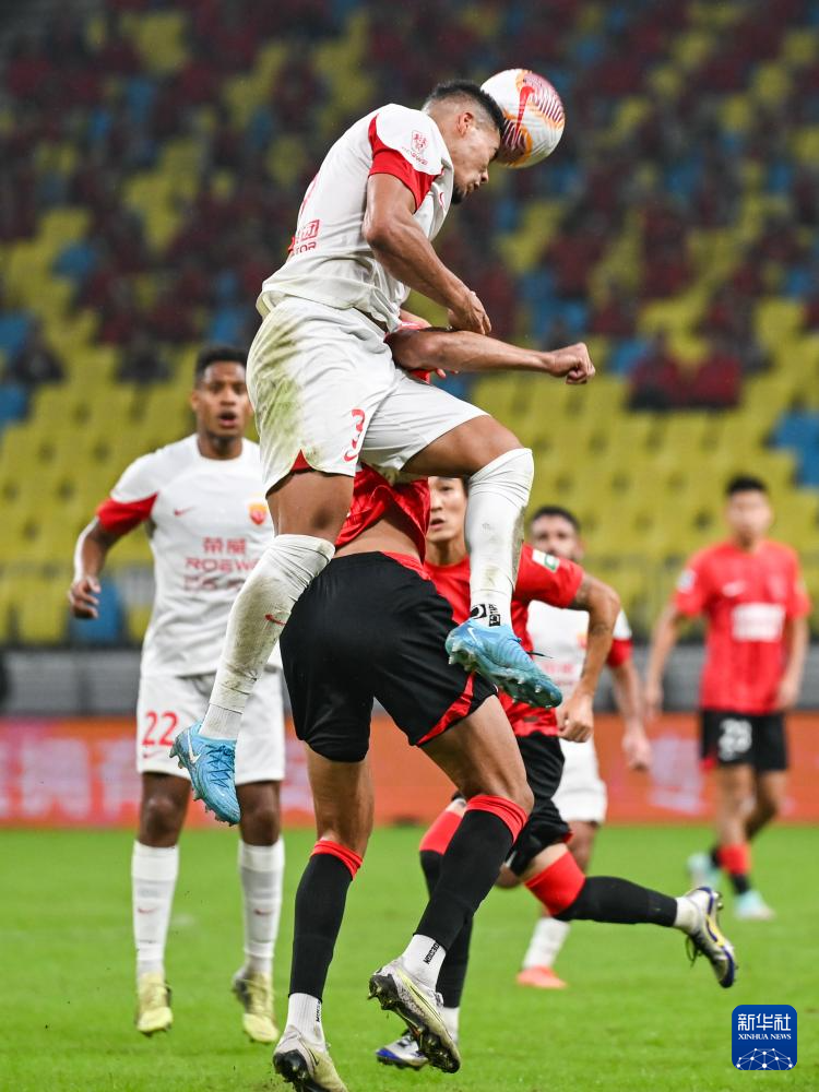 10月18日,成都蓉城队球员周定洋(右一)和上海海港队球员魏震(右二)在比赛中争顶。