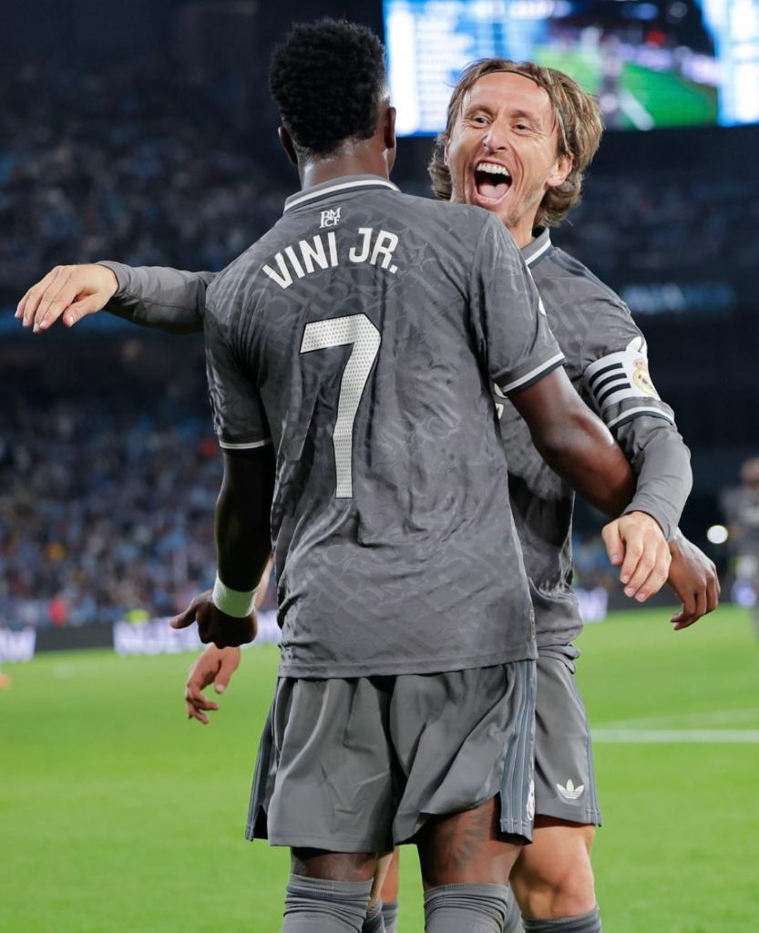 皇马球员莫德里奇(右)与维尼修斯庆祝进球。图片来自西甲联赛官方社交账号