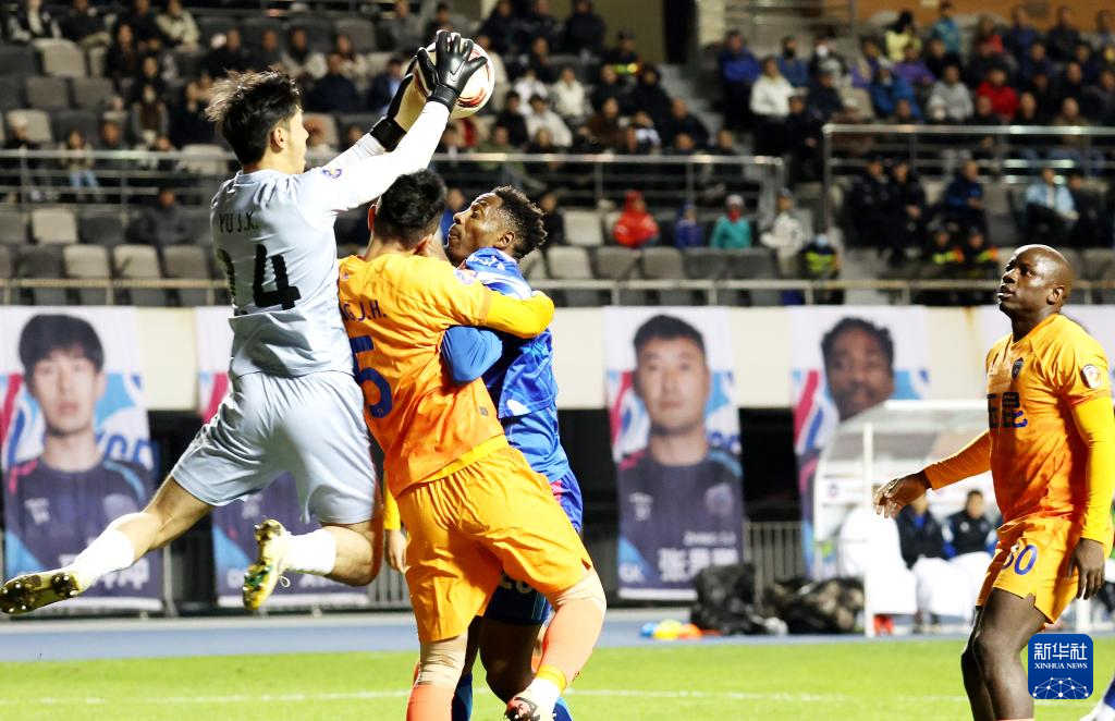 10月19日,云南玉昆队守门员余鉴贤(左一)在比赛中扑救。