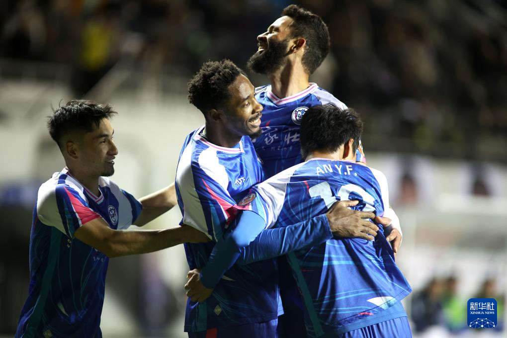 10月19日,石家庄功夫队球员梅西·保利(左二)与队友庆祝进球。