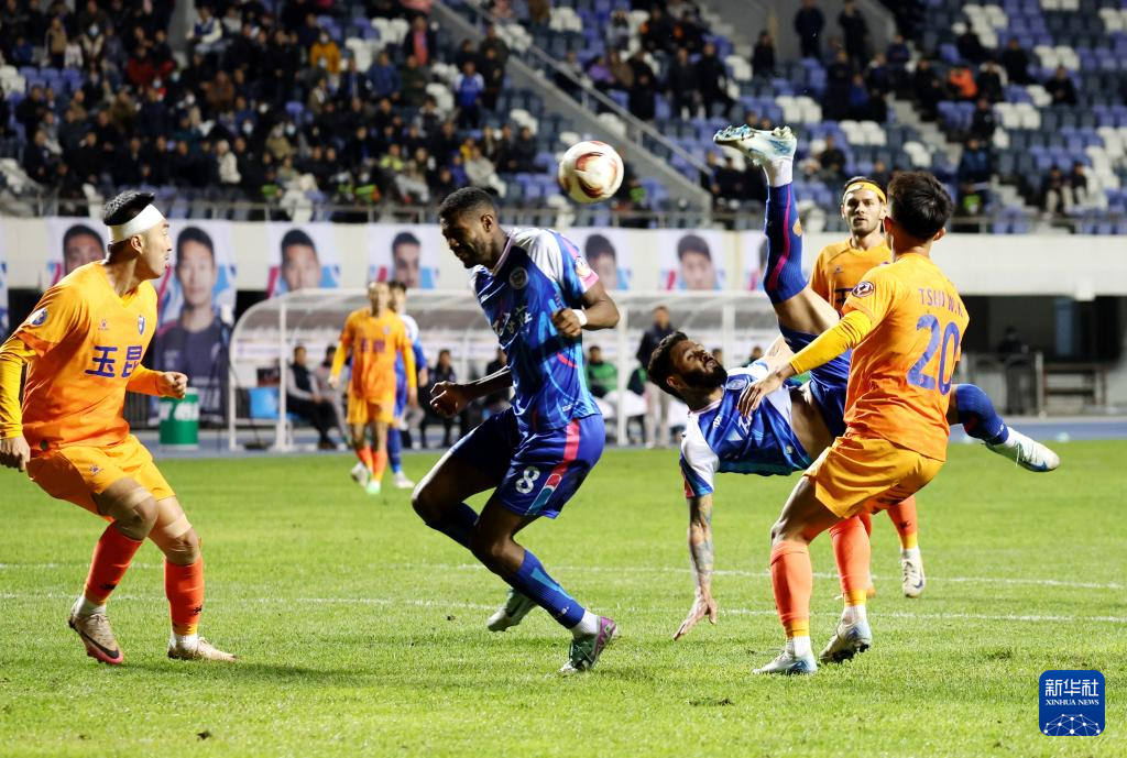 10月19日,石家庄功夫队球员埃里克斯(右三)在比赛中倒钩射门。