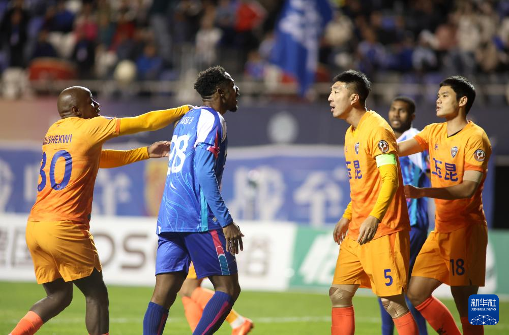 10月19日,石家庄功夫队球员梅西·保利(左二)与云南玉昆队球员姜积弘(左三)在比赛中发生争执。