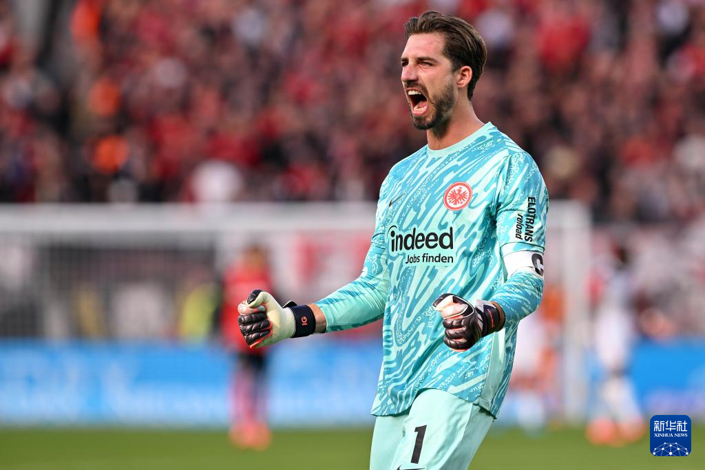 10月19日,法兰克福队守门员特拉普扑救成功后庆祝。