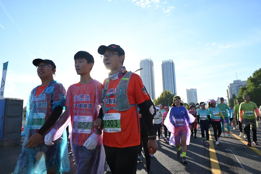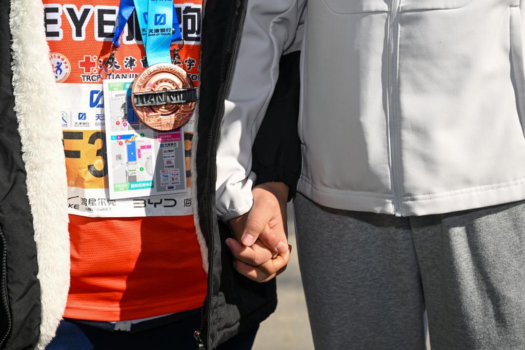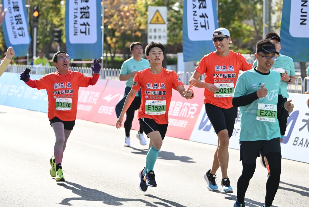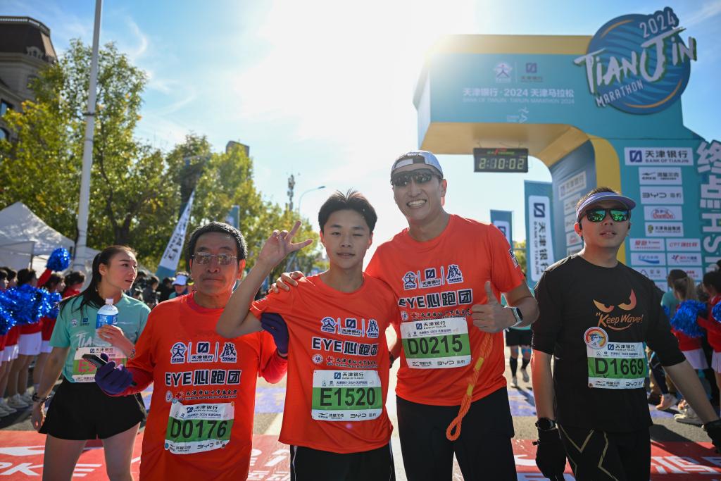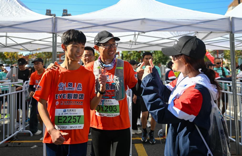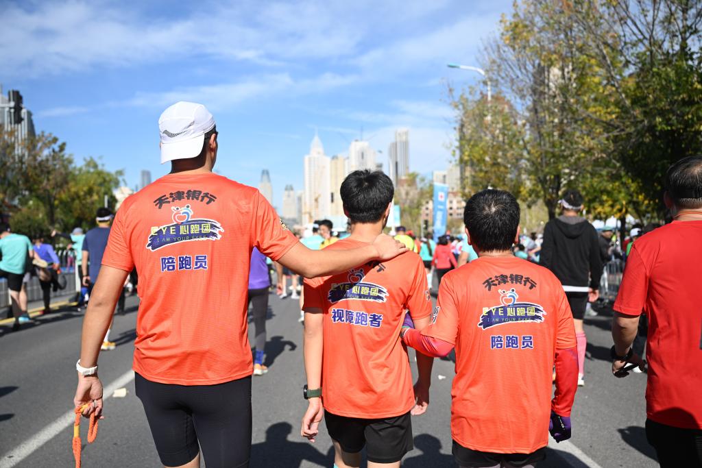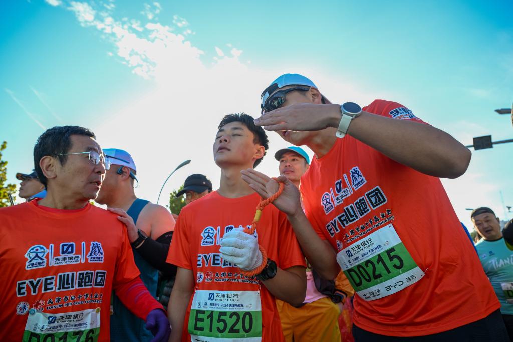 参加2024天津马拉松的“EYE心跑团”由天津市红十字基金会组建,跑团6名参赛者是天津市视力障碍学校在校生和毕业生,14名志愿陪跑员同程伴跑。