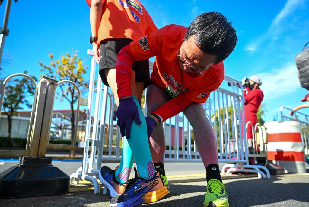 陪跑员马长军(右)帮助“EYE心跑团”选手李泽洲拉伸肌肉(10月20日摄)。新华社记者 孙凡越 摄