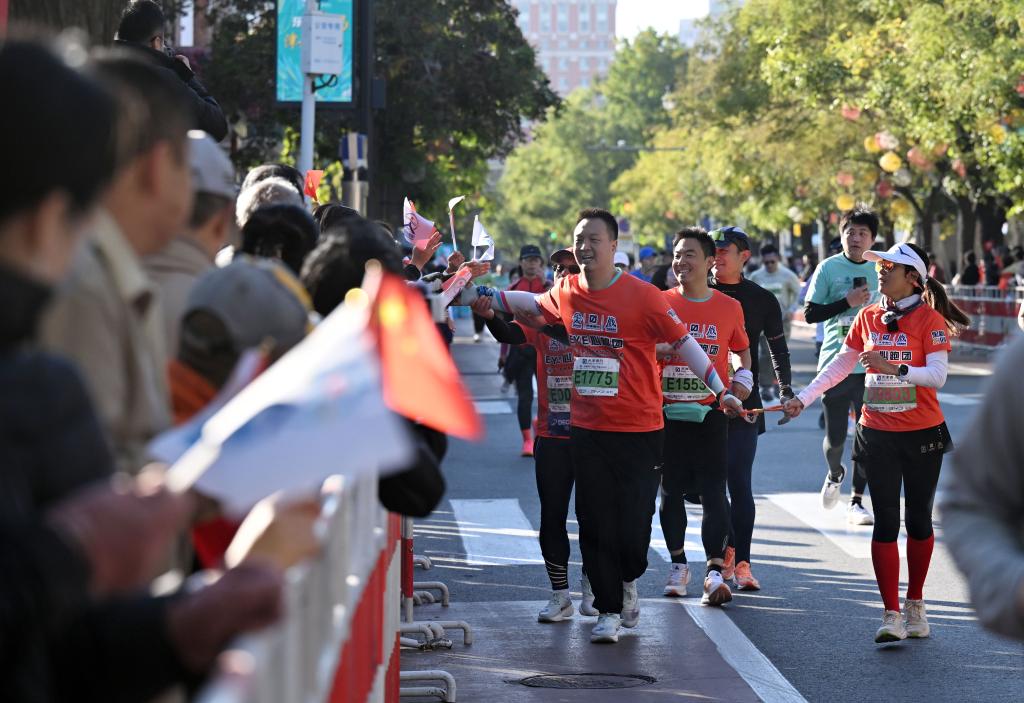 10月20日,2024天津马拉松鸣枪开跑。今年的天津马拉松赛场首次出现视障选手跑团。在爱心陪跑员的引导下,多名视障青年完成了人生中首次马拉松赛。