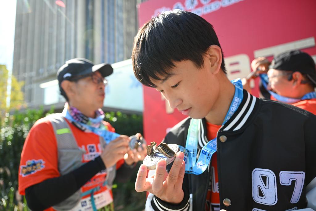 “EYE心跑团”选手丁思琦赛后欣赏完赛奖牌(10月20日摄)。新华社记者 孙凡越 摄