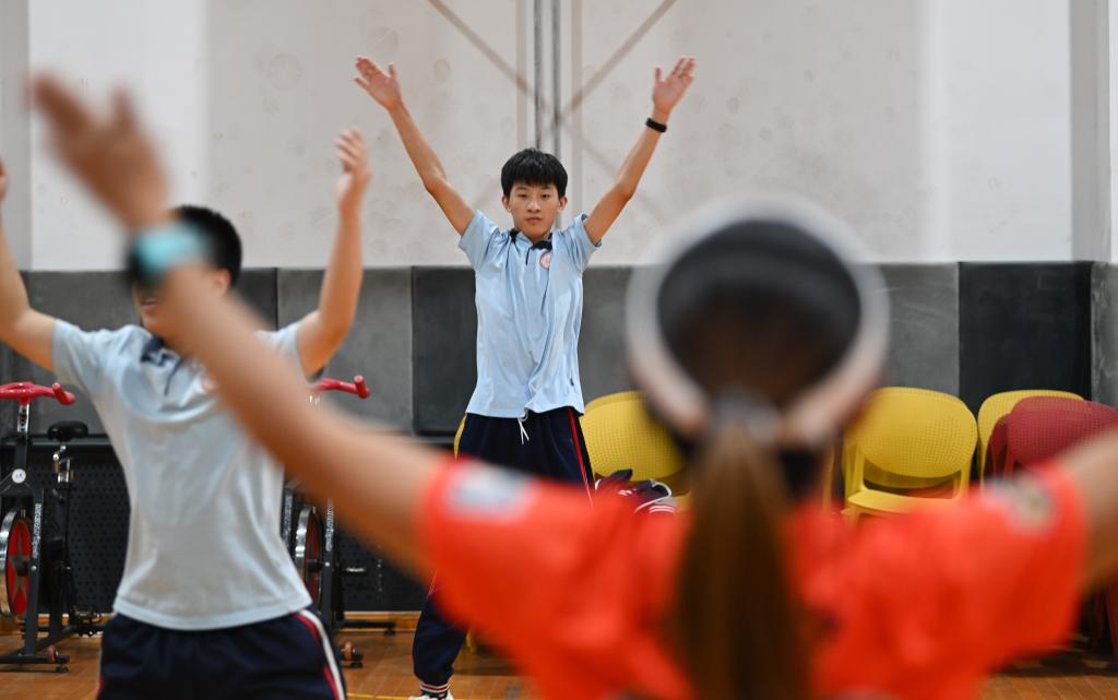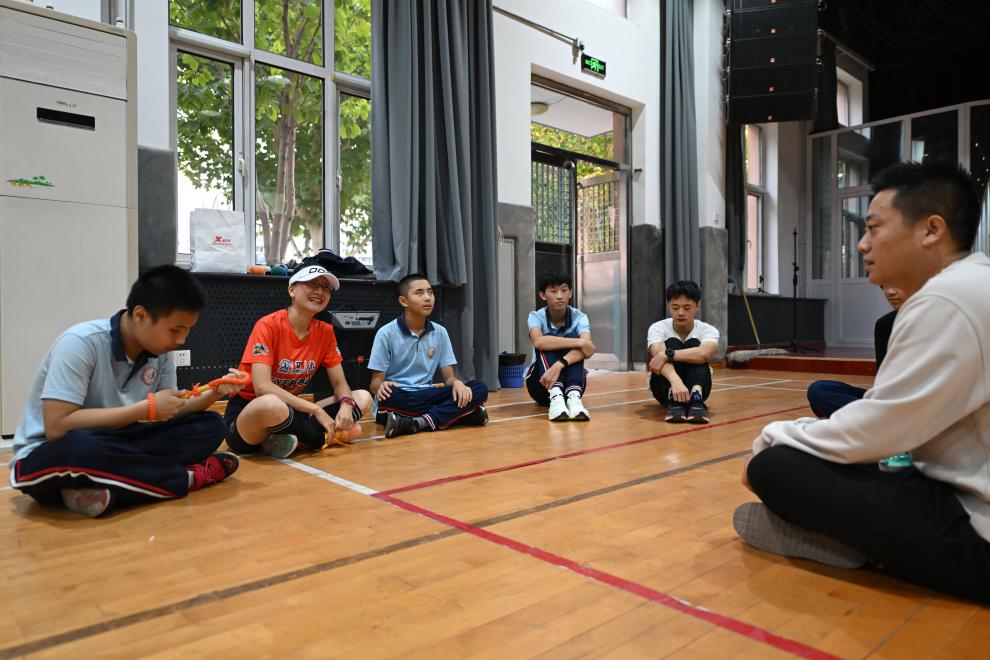 陪跑员带领“EYE心跑团”选手李泽洲在天津市视力障碍学校训练(10月16日摄)。新华社记者 孙凡越 摄