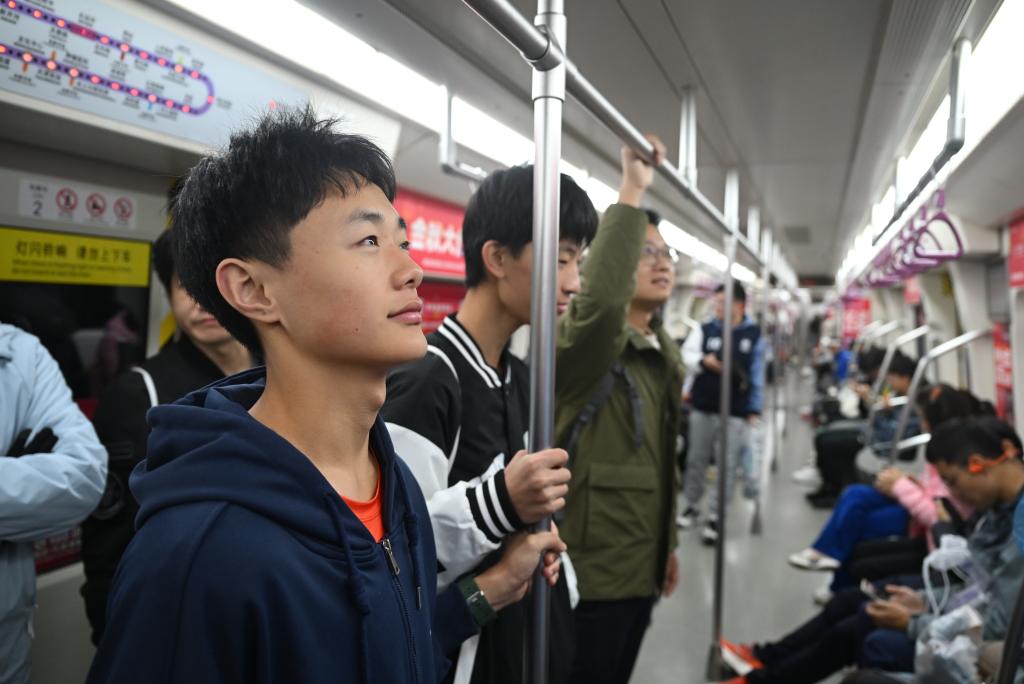 “EYE心跑团”选手李泽洲(左一)、丁思琦(左二)在辅导教师赵鸿祥的带领下搭乘地铁前往赛场(10月20日摄)。新华社记者 孙凡越 摄