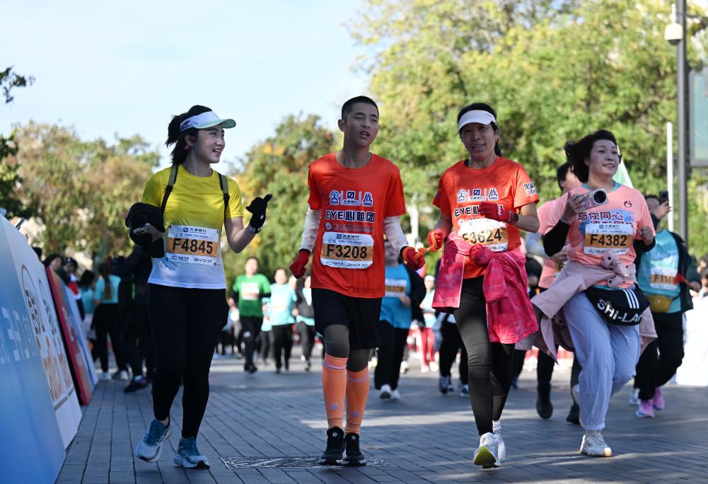 “EYE心跑团”选手苑嘉乐(左二)和陪跑员王秀娟(右二)、杜津(左一)在比赛中(10月20日摄)。新华社记者 赵子硕 摄