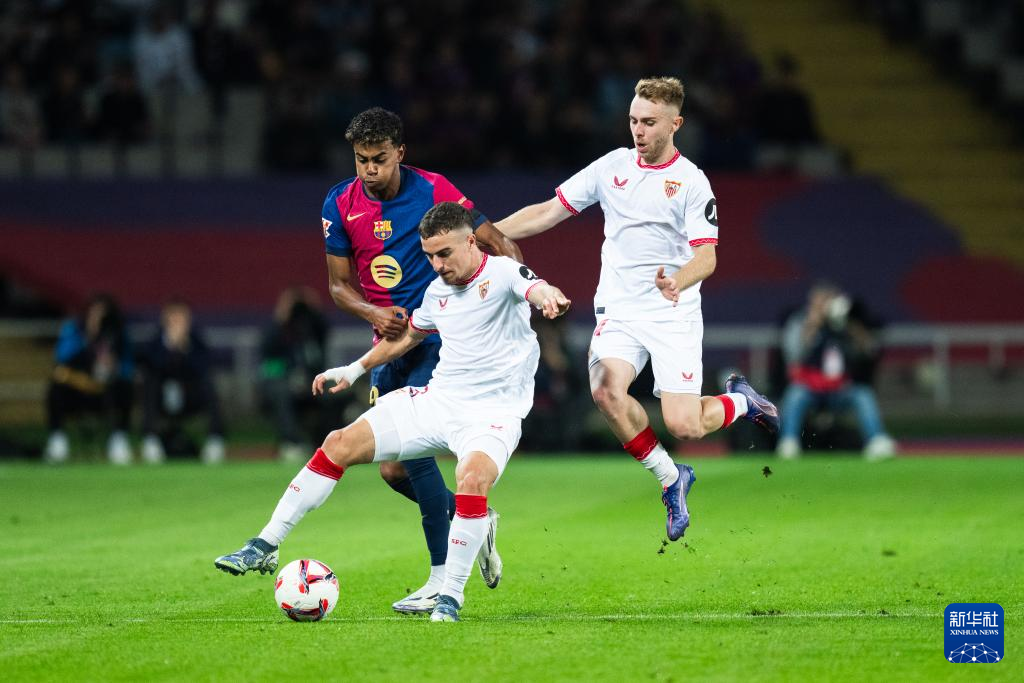 10月20日,巴塞罗那队球员亚马尔(左)与塞维利亚队球员佩德罗萨(中)和佩克拼抢。