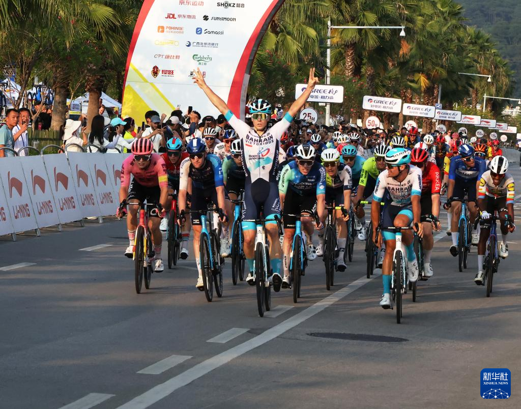 10月20日,巴林胜利车队斯洛文尼亚车手马特维茨·戈夫卡(中前)率先冲线后庆祝。