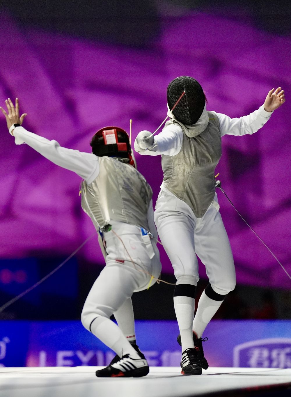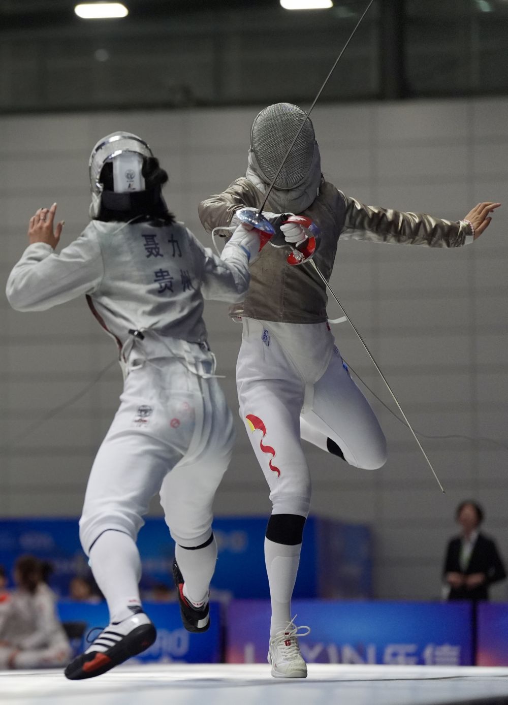 杨恒郁(右)在女佩团体决赛中