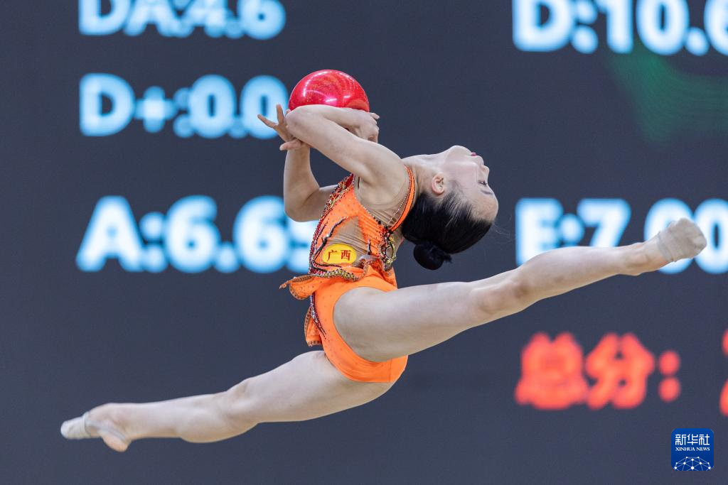 10月22日,广西队选手梁李爱在少年A组个人球操决赛中。最终,她以总分25.60分的成绩获得亚军。