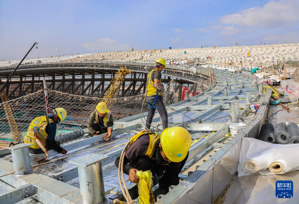 10月23日,施工人员在南沙综合体育场屋面安装隔音棉层。