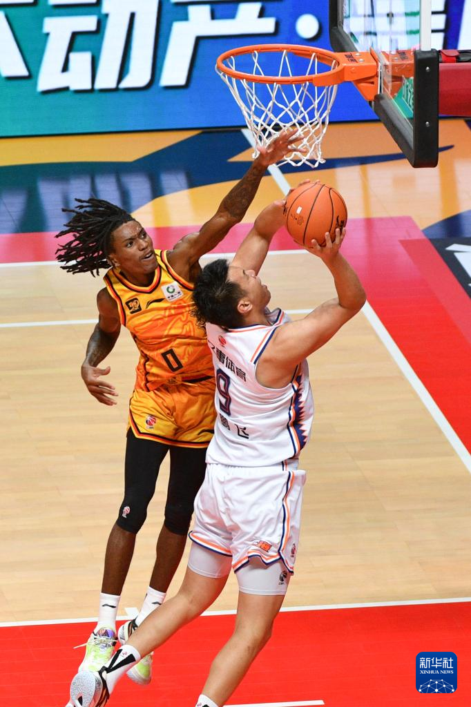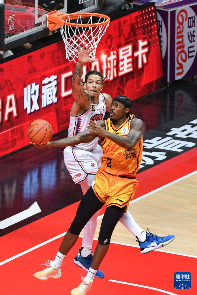 10月22日,上海久事队球员闫鹏飞(右)在比赛中上篮。