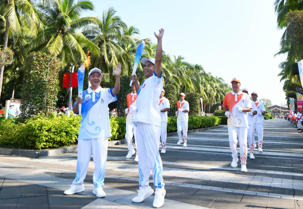 10月9日,第十棒火炬手梁永朝(左)与第十一棒火炬手陈秀兴进行火炬传递。当日,第十二届少数民族传统体育运动会火炬点燃暨火炬传递启动仪式在三亚市天涯海角举行。新华社记者 杨冠宇 摄