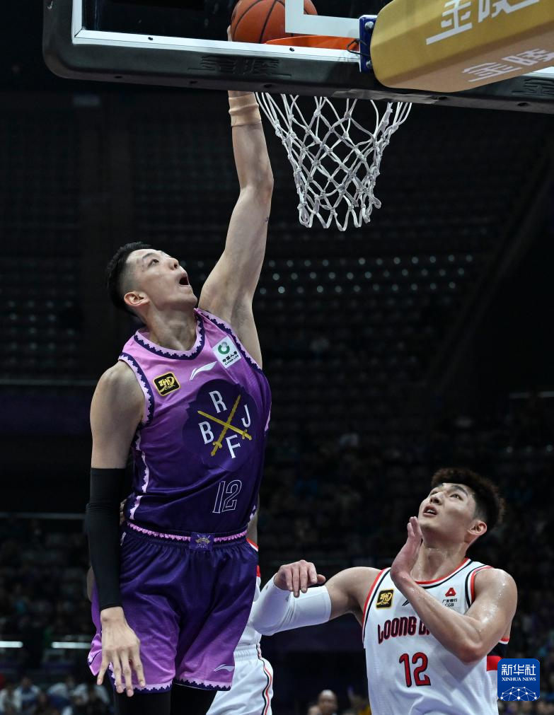 10月23日,北京控股队球员沈梓捷(左)在比赛中扣篮。
