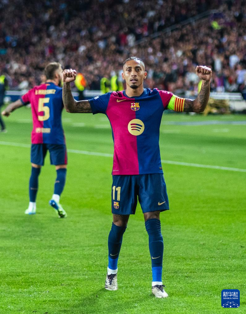 10月23日,巴塞罗那队球员拉菲尼亚在比赛中庆祝进球。