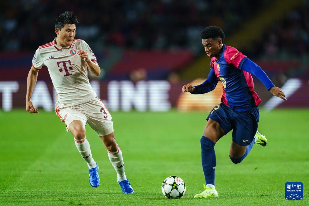 当日,巴塞罗那队球员巴尔德(右)与拜仁慕尼黑队球员金玟哉在比赛中拼抢。