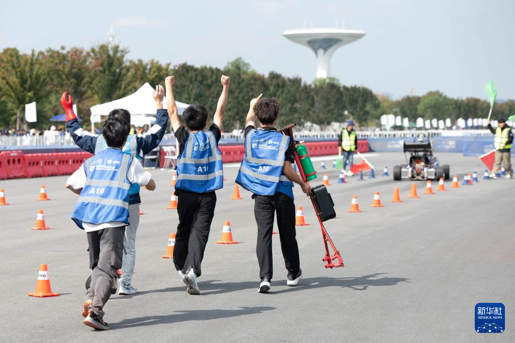 10月25日,深圳职业技术大学无人驾驶车队成员在赛车通过制动测试后庆祝。