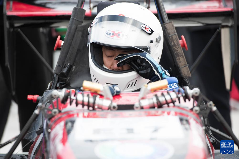 10月25日,河北工程大学车手刘闻骁在赛车通过制动测试后激动落泪。