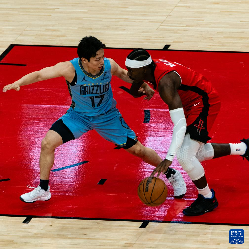 10月25日,灰熊队球员河村勇辉(左)在比赛中防守。