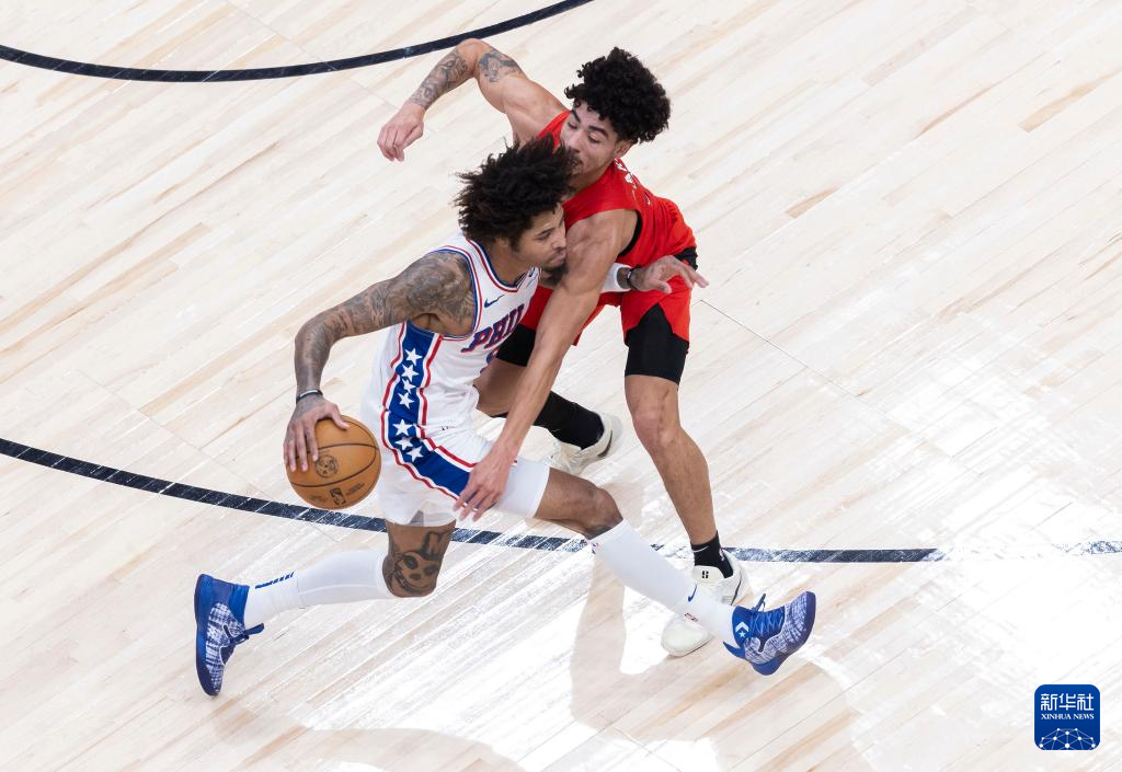 10月25日,猛龙队球员巴恩斯(右)和76人队球员凯莱布·马丁在比赛中。