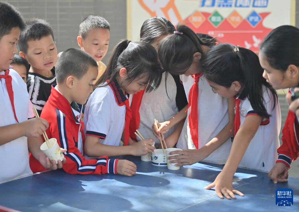 在梧州市平浪希望小学,学生们在体育大课间练习夹玻珠(10月25日摄)。