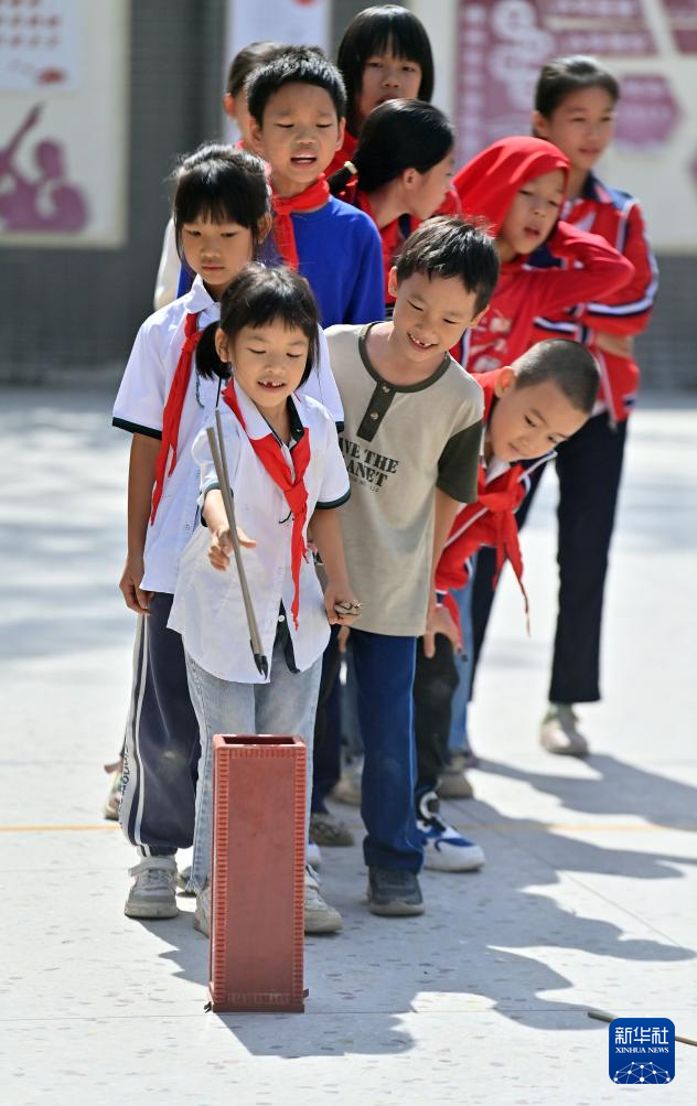 在梧州市平浪希望小学,学生们在体育大课间练习投壶(10月25日摄)。